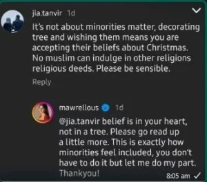 ماورا حسین نے جواب میں لکھا کہ،’عقیدہ دل میں ہوتا ہے وہ درخت پر نہیں ہوتا’۔اُن کا مزید کہنا تھا کہ ‘جو کام انہوں نے کیا ہے اس سے اقلیتوں کو ساتھ شامل کرنے کا احساس ہوتا ہے’۔