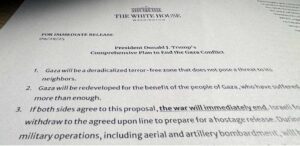 واشنگٹن نے غزہ جنگ کے خاتمے کے لیے ایک 21 نکاتی منصوبہ پیش کیا ہے جس کا مقصد نہ صرف جنگ بندی بلکہ علاقے کی سیاسی، سماجی اور معاشی بحالی کو ممکن بنانا ہے۔ منصوبے کے تحت غزہ کو ایک غیر انتہا پسند، دہشت گردی سے پاک علاقہ بنایا جائے گا جو اپنے ہمسایوں کے لیے خطرہ نہ ہو گا۔