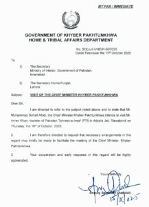 مراسلے کے مطابق وزیر اعلیٰ خیبر پختونخوا محمد سہیل آفریدی نے عمران خان سے ملاقات کے لیے کل ( 16 اکتوبر ) کو اڈیالہ جیل جانے کا فیصلہ کیا ہے۔