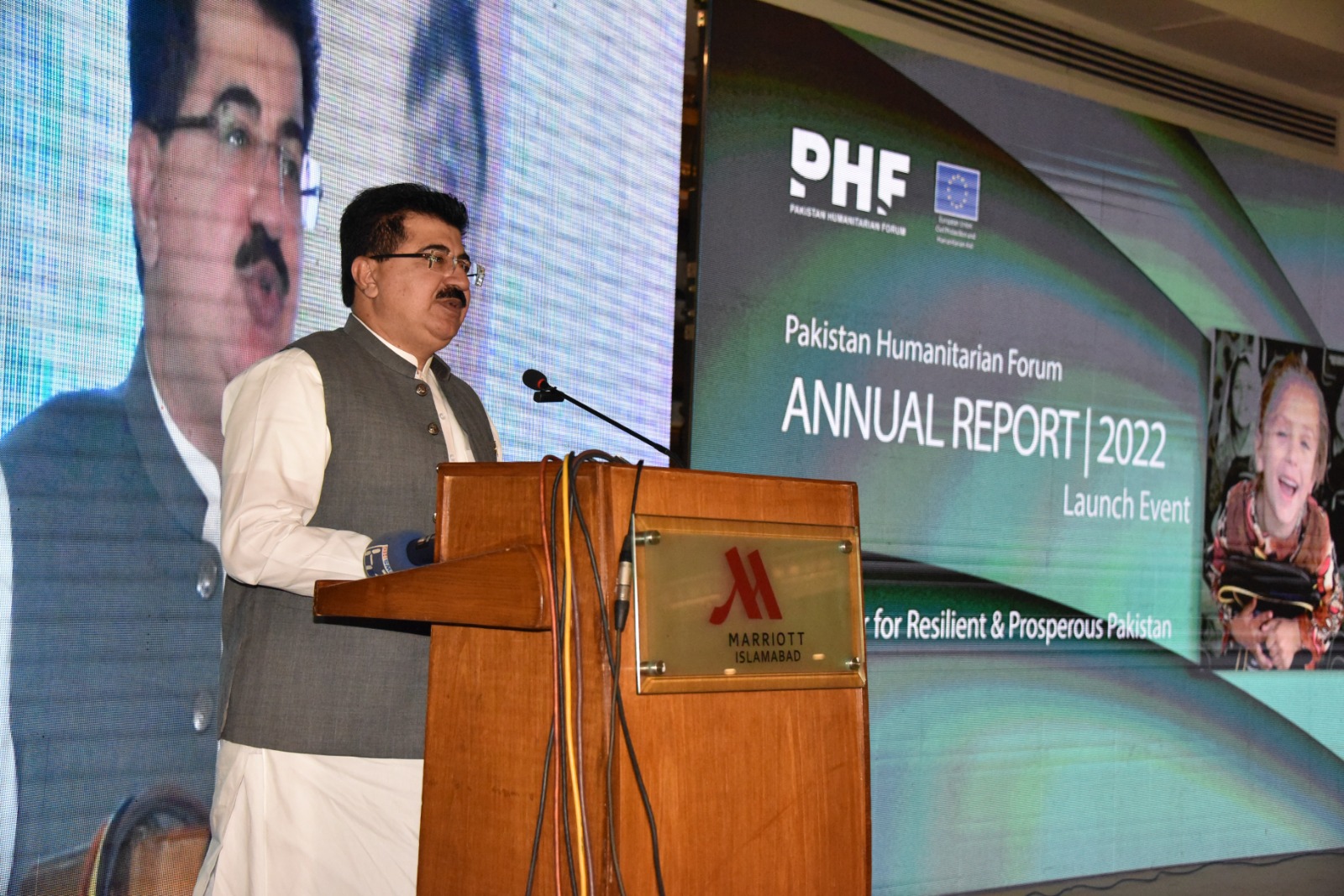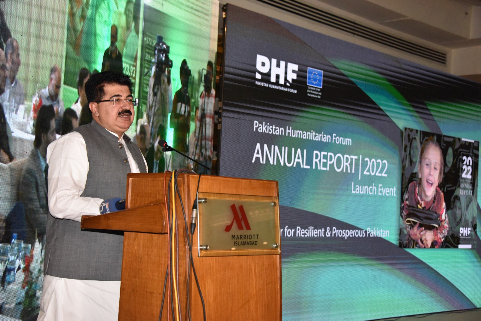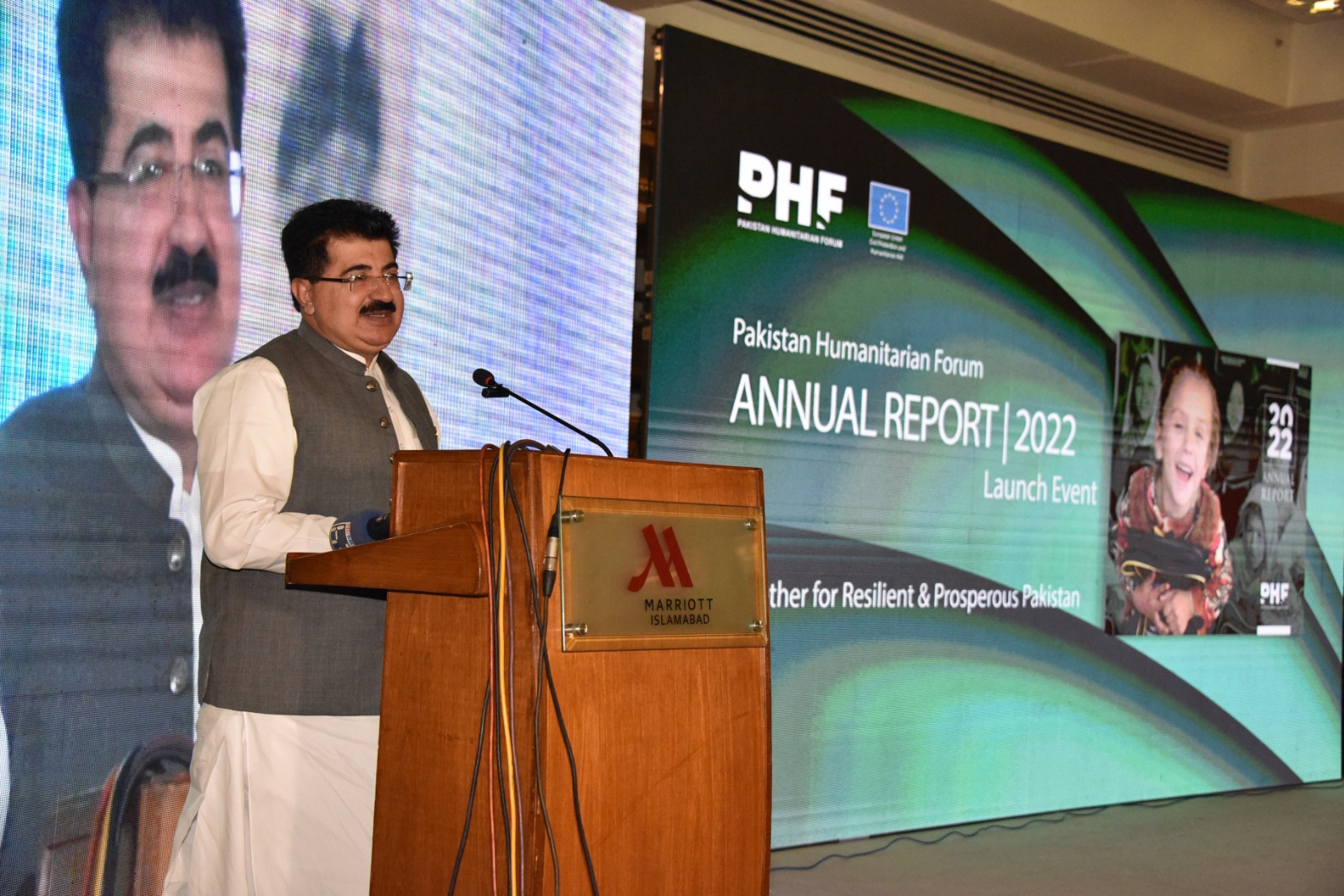 چیئرمین سینیٹ محمد صادق سنجرانی نے تقریب کے شرکاء سے خطاب کرتے ہوئے کہا کہ Pakistan Humanitarian فورم (پی ایچ ایف) نے پاکستانی عوام کی ترقی اورخاص طور پر تباہ کن سیلاب کے بعد متاثرہ افراد کی امداد اور بحالی کیلئے بھرپور کوششیں کیں اور ہم اْنکے اس غیر معمولی جذبے اور کاوشوں کو سراہتے ہیں۔