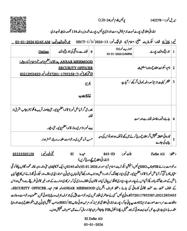 گزشتہ رات تھانہ سیکرٹریٹ ایریا کی حدود میں واقع قائداعظم یونیورسٹی کے گرلز ہاسٹل نمبر 5 میں ایک نوجوان دیوار پھلانگ کر داخل ہو گیا، جس کی ویڈیو سوشل میڈیا پر وائرل ہو گئی۔